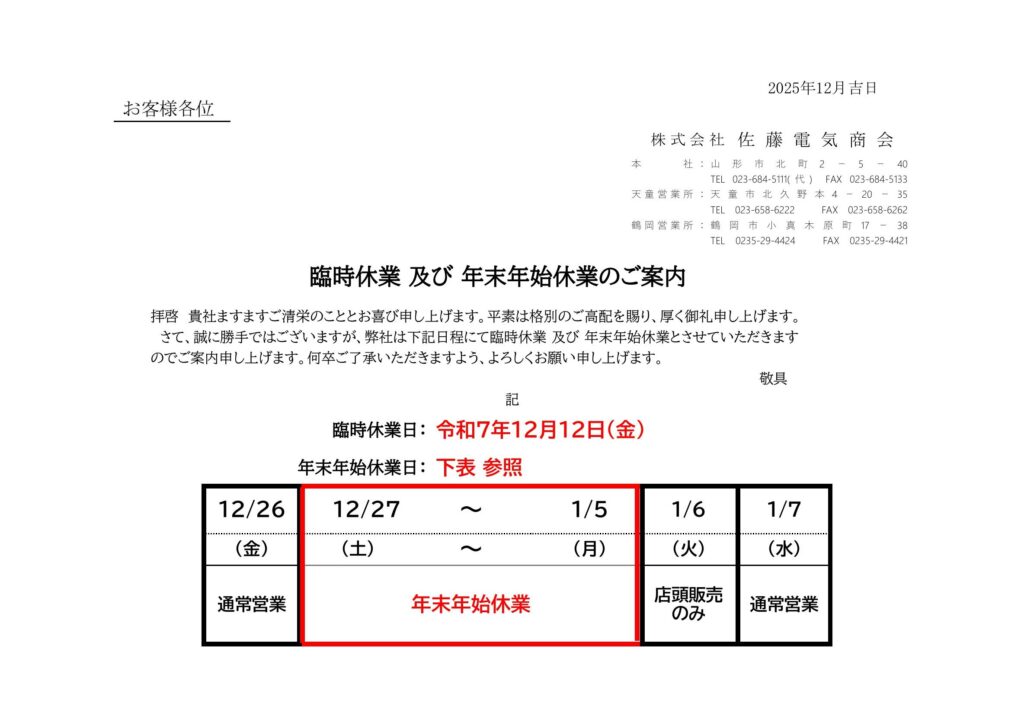 臨時休業及び年末年始のご案内